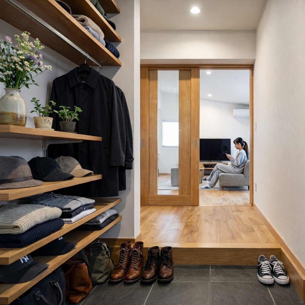 玄関にも収納スペースを用意。リビングもすっきり♪