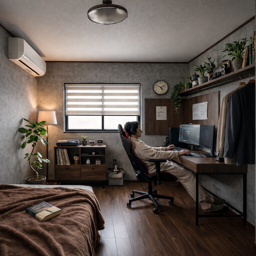 洋室は、コンクリート調クロスとウォールナット床。PCデスクをおけば、隠れ家的書斎に様変わり! 落ち着きのあるインテリアで揃えれば、プライベートの時間も充実するはず。自分の部屋を持ちたいという夢を持っている人は、きっと「こんな家に住みたいなあ」と思うでしょう。